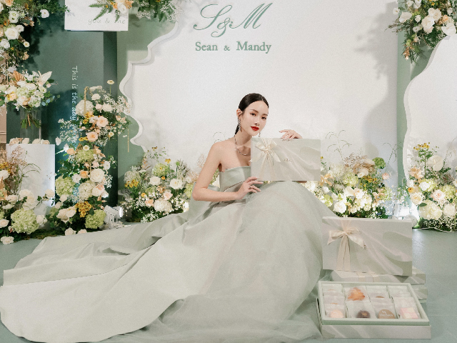 輕柔嫩綠色搭配上珍珠白緞帶